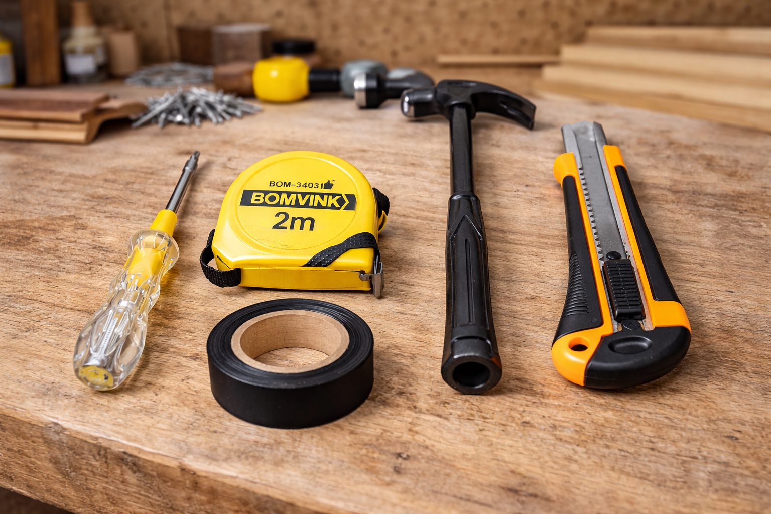 Kit de ferramentas ideal para pequenos reparos domésticos e trabalhos em marcenaria. Contém martelo resistente, estilete retrátil, trena de 2 metros, caneta teste de energia e fita isolante. Conjunto prático, compacto e indispensável para o dia a dia.