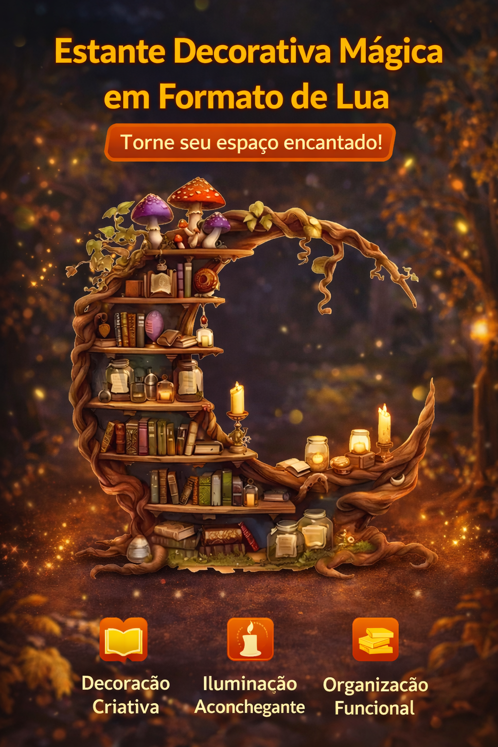Transforme seu ambiente com charme e fantasia! A estante decorativa em formato de lua traz um design encantador inspirado no universo mágico, perfeita para organizar livros, velas, frascos e objetos decorativos. Ideal para quartos, escritórios ou cantinhos de leitura, ela une funcionalidade e estilo, criando um ambiente acolhedor e cheio de personalidade.
