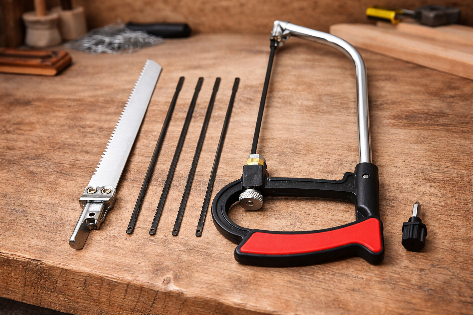 Kit completo de serra manual ideal para marcenaria, artesanato e pequenos reparos. Acompanha arco de serra resistente com empunhadura ergonômica, 4 lâminas finas intercambiáveis para cortes detalhados e 1 lâmina larga para cortes mais robustos. Possui sistema de fixação firme que facilita a troca das lâminas, garantindo praticidade e precisão no uso.